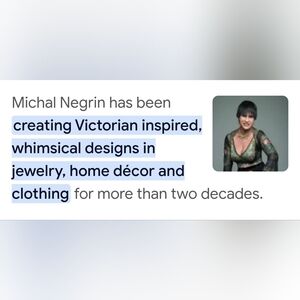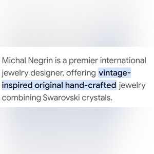 Michal Negrin is a premier international jewelry designer, offering vintage-inspired original hand-crafted jewelry combining Swarovski crystals.
