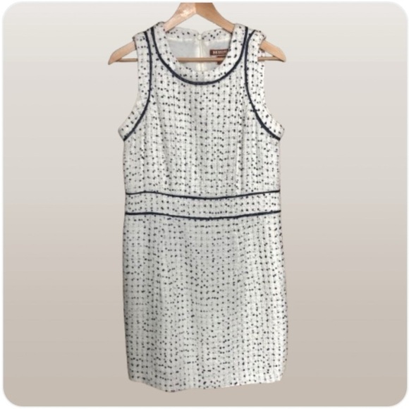 Micheal Kors Classic Sleeveless Tweed Dress Size 12 Look fabulous in this timeless and classic intros Audrey Hepburn inspired tweed dress from Michael Kors. The dress features a round neckline, sleeveless design, and a slimming sheath style that flatters your figure. The faux leather trim adds a touch of sophistication. Please note some wear on trim back near the neck and front around arms. P