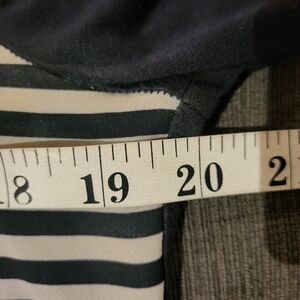 Stylish navy and white striped long sleeve top. Features a buttoned neckline.