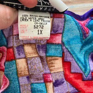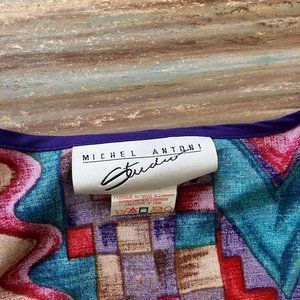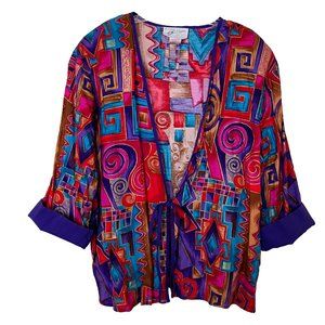 Vintage 90s Michel Antoni Studio tie-front top in a colorful, bold abstract print with fold-up sleeve cuffs in contrast purple. Beautiful jewel-tone print with gold outlines. Has shoulder pads (could be easily removed). 100% rayon, made in Canada. Tag size "1X" - see below for garment measurements. Pre-owned condition: left purple sleeve cuff has a small rust-colored spot on the back of cuff - see close-up photo.