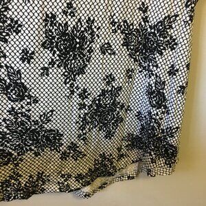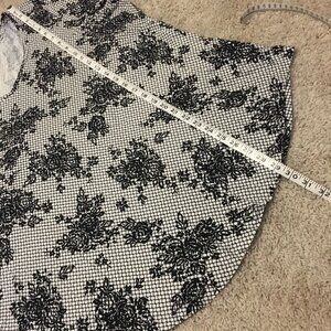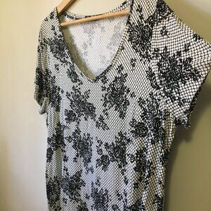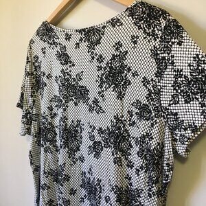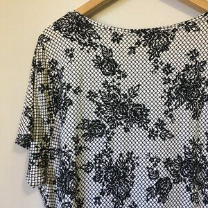 Very good preowned condition, black and white floral lace print, stretchy, bouncy, V-neck modern tee by Michel Studio.