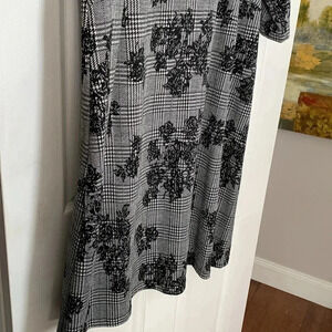 Never worn. Pretty dress with short sleeves. Round neck. Stretchy and flattering a-line dress. Floral over plaid pattern- black, white, grey. Immaculate. Size 1X.