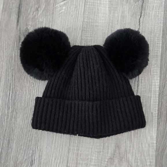Fun black toque with 'ears' like Mickey Mouse!! Very soft pompoms and the inside of the hat is a fuzzy fur lining to keep you extra warm. Has only been worn a couple of times, still in excellent preloved condition.