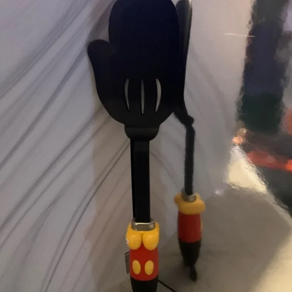 Fun Mickey Mouse hand-shaped spatula. Perfect for Disney fans. Features iconic black, red, and yellow colors.