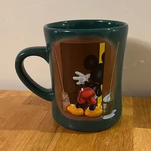 Charming Disney mug with Mickey Mouse peeking from a door. Dark green color adds elegance. Perfect for Disney fans.