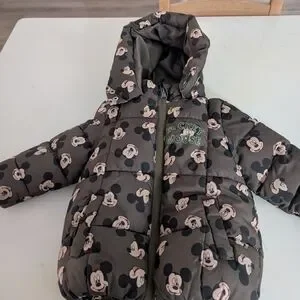Stylish Mickey Mouse puffer jacket with hood. Features a playful design with iconic character print.