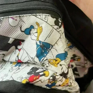 Mickey and Minnie cartoon backpack. Great condition. Numerous compartments. Adjustable straps. Laptop compartment. One of the Mickey tabs is missing in the back compartment zipper. See pic