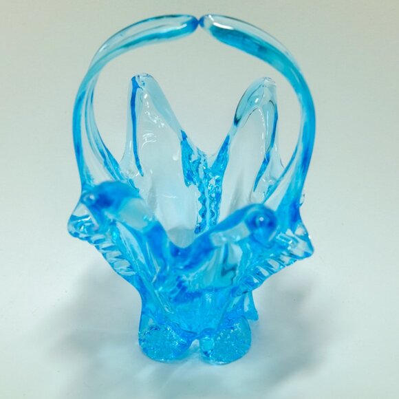 A super cute little mid century blue Chalet glass basket from the 1960s with a split handle and flower petal opening.