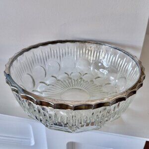 Mid Century (1950s) Queen Anne cut class bowl, made in France with silver plated rim made in England. Has some tarnishing, glass is in excellent condition. Measures 9 inches diameter by 3.25 inches tall. Cat friendly, nonsmoking home.