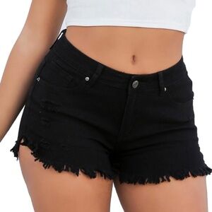 Mid Rise Black Denim Distressed Shorts
