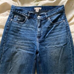 Mid rise full length straight jeans. Flattering dark blue denim with a bit of lighter areas from wear. Raw hem.