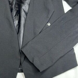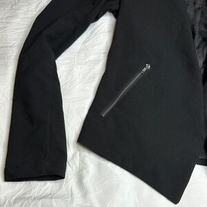 Like new. No rips, stains, tears or damages. No fading or pilling. Colour is black. Great casual/dressy/business piece. Light material not super structured like a regular suit jacket and is more of a mid length.