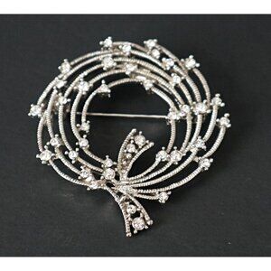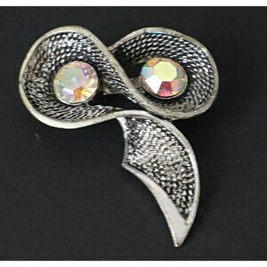 For your consideration is a collection of five mid-century modern brooches offers timeless elegance with intricate silver-tone designs, accented by Alaskan Diamond, Aurora Borealis cyrstals and rhinestones. Each piece is in good condition, featuring functional clasps, and captures the craftsmanship of the era. A sophisticated addition to vintage accessories or jewelry collections.