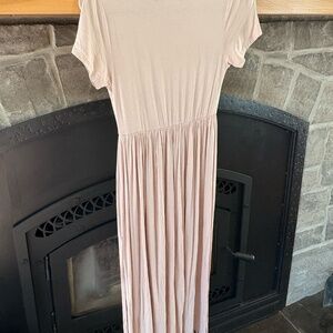 This mid-length t-shirt dress with an elastic waist is made from a soft rayon and spandex blend, offering stretch and comfort for everyday wear. Featuring a classic scoop neckline, short sleeves, and side slits for easy movement, this dress is perfect for casual days, travel, or layering with jackets and cardigans. The simple silhouette makes it a versatile staple for any wardrobe.