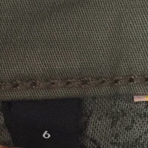 Classic army green color mid-rise tapered cropped (ankle) pants. Cotton stretch (lightweight) twill. Front pockets, fake welt pockets (back). Zip closure with removable sash. Very comfortable fit.