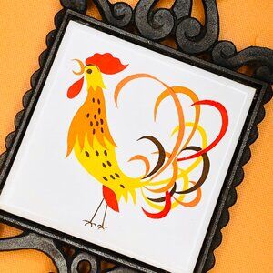 Midcentury Rooster Cast Iron Ceramic Tile Trivet Vintage Country Kitchen Decor