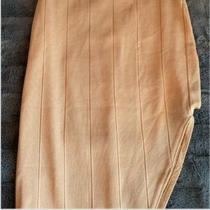 Trendy asymmetrical tan body con skirt. Hit's at about mid length on one side, and upper thigh on other. Tags removed, but has never been worn.