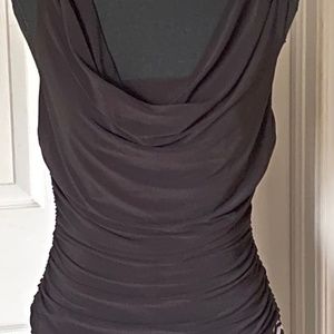 -Bodice is sleeveless with a draped and ruched front, V-shaped opening on back with ruching