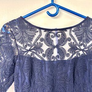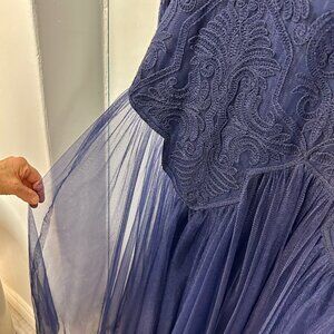 Beautiful dark blue formal dress. Lace top, drop waist and long sleeves. Flattering boat neck. The skirt is multiple layers of tulle with an underlay. Size 8. Worn once to a wedding and it's in perfect condition. I paid $630.00. Selling for $300.00.