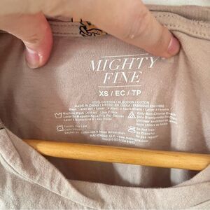 Mighty Fine, tan, beige, neutral tone, soft brown, peace sign graphic, graphic tee, printed design, retro print, vintage-inspired, cap sleeve, short sleeve, cotton, 100% cotton, soft fabric, breathable, lightweight, natural fiber, relaxed fit, casual tee, crew neck, classic fit, everyday wear, street style, music festival outfit, summer casual, laid-back look, boho vibe, retro aesthetic, '70s inspired, peace and love theme, minimalist color, cozy staple, layering piece, concert tee, weekend wear, day off style, lounge-ready, creative dresser, peace lover, vintage graphic fan, free-spirited style, artsy casual, casual-cool, conscious fashion, timeless message, capsule wardrobe with character.