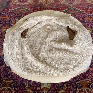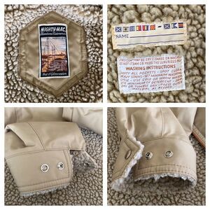Beige, two way front zipper, faux shearling lining plus insulated sleeves, adjustable cuffs, slit pockets and tan leather trim.