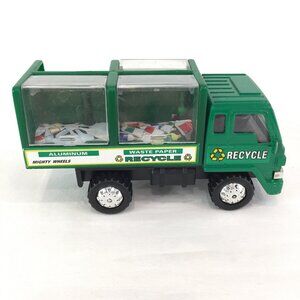 This is a Mighty Wheels recycle truck. It is used and missing one of the plastic covers. It has paper inserts that picture cans, paper, glass and bottles. It is between 11 and 12 years old. The front part is metal and the rest of it is plastic. It is 4.5 inches long. Preloved it has some surface scratches and a some paint wear on top corner. Also missing one plastic cover. It is in good working condition.