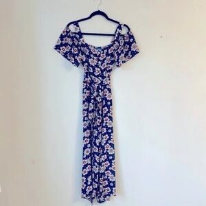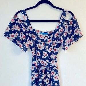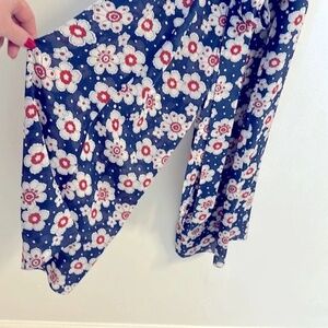 Beautiful, navy silk belted jumpsuit with white, red, blue floral design with polkadots. Size extra small