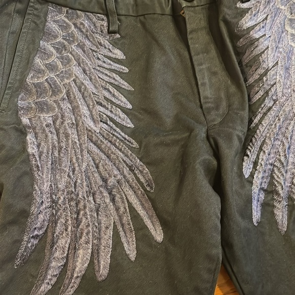 Rare Mihara Yasuhiro black straight-leg pants featuring striking embroidered angel wing detail on the front. A standout Japanese designer piece blending avant-garde luxury with wearable streetwear.