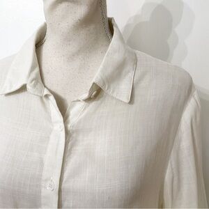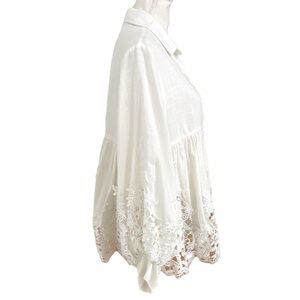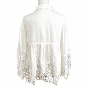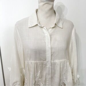 MIHO CREAM BUTTON FRONT EMBROIDERED PUFFY BOHEMIAN TUNIC BLOUSE, a sheer texutred off white/ cream embroidered button front collared tunic blouse with very puffy embroidered long sleeve - open lace embroidery - nothing at cuff - small fringe at the bottom hem - losse fit / oversized yet not stretch - empire waistline. Bohemian / free spirited, perfect with a jeans or a corduroy pant. Made in Italy - high quality brand.