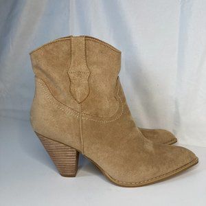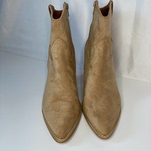 Mi.im Cosette Western Heeled Ankle Boots Size 8 1/2 Almond Tan in Color with an inside zip closure, 3" heel and 8 1/4" total boot height. These cute boots are NEW unworn condition and material is faux suede.