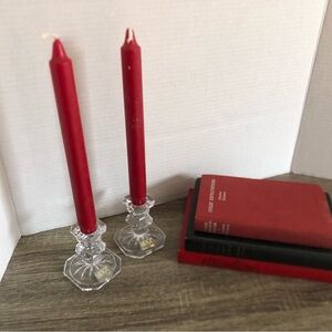 Enhance your home decor with these elegant clear glass candle holders from Mikasa. Perfect for adding a touch of sophistication to any room. Made in Slovenia. Comes with original box. 3” tall each.