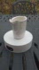 It is made of porcelain or stoneware and features a raised floral and grape design on a basketweave background.