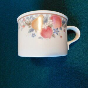 Mug in the Trattoria (CAC40) pattern, tan trim with fruit and flowers, circa 1990 from their Intaglio line