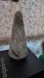 The glass object is a ribbed, iridescent art glass piece, shaped like a conical Christmas tree, with a white base color and swirling patterns of gold or brown,  by Mikasa and in the Murano style.