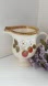 Brown band around rim. Measures 4 3/8" tall and hold 8 oz.