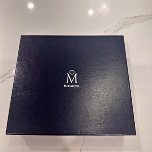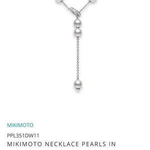 Miki moto pearls in motion necklace. Akoya cultured pearls 18k white gold with .20ctw diamond clasp, 19” in length. The pearls can move along the chain and stay where placed. Can be worn as a lariat or many other ways. Also included 7mm pearl studs set in white gold