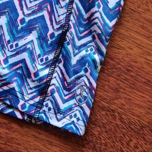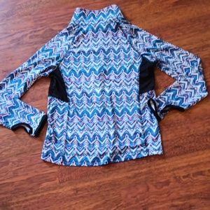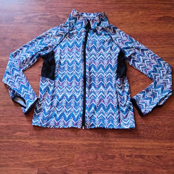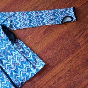 blue, white and neon pink chevron print athletic zip-up with thumb holes on sleeves and dry-wick fabric under arms
