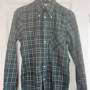 Rare slim fit green check shirt from Mikkel Rude, a now defunct brand which made mod/suedehead/traditional skinhead clothing. Size XS with a slim fit. Large button down collar and striking details. Some pilling on the fabric.