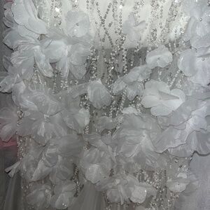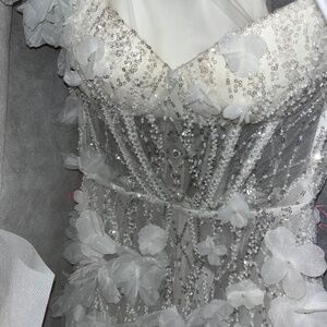 Dazzling semi-transparent trumpet wedding gown sprinkled with 3D flowers and fully covered in beadings and sequins. Featuring a lace-up closure on the back, a puffy tulle skirt, and beaded straps with 3D flowers.