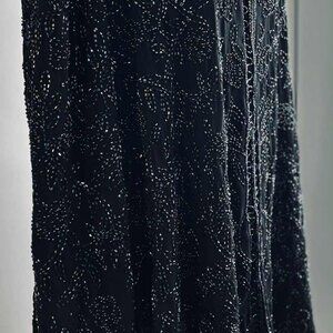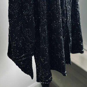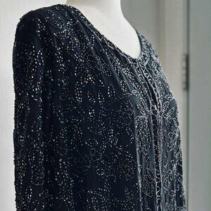 An exquisite hand-beaded evening jacket from Milano, crafted on a fluid black rayon base and fully embellished with iridescent glass beads that shift from violet to teal in the light. The botanical beadwork is applied entirely by hand, creating dimensional texture and a refined drape with substantial weight. Made in India, renowned for its expert bead artisans, the piece features a full hook-and-eye front closure, long sleeves, and discreet side slits that enhance movement while preserving the clean, structured line. Selected for its craftsmanship, richness, and rare level of detail, this is an elevated statement jacket with enduring elegance.