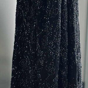 • Design details : full hook-and-eye front closure; allover hand-applied botanical beadwork; long sleeves; side slits; fluid evening silhouette.
