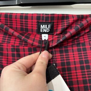 Bold and trendy red and black plaid pants from Mile End. These pants are new with tags and crafted from a stretchy material that ensures a flattering fit. Although tagged as size 16, they fit more like a size Small. Ideal for grunge or alt-inspired looks. Waist: 13.5in | Inseam: 29in. Condition: New with tags