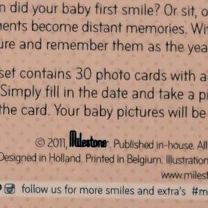 Milestone Baby Cards Comprehensive Set Includes cards covering major milestones. In almost new condition includes 27/30 cards We decided not to write on the cards so this could be reused by others. 2 cards had writing erased see last photo.