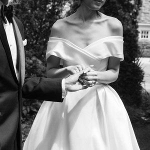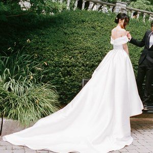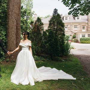 This wedding gown is what dreams are made of. After trying 50+ dresses across different boutiques in Canada from Vera Wang, to Berta, to Galia Lahav, this gown was the clear winner. I absolutely fell in love with the modern feel and contemporary cuts of Milla Nova. I bought this for ~$3500 CAD after taxes and fees. It is made from royal mikado, with off-the-shoulders bodice and a grand train that is such a statement maker! I love that it also has hidden side-seams pockets - because no bride is wearing a purse on their wedding day! You really don't have to compromise on beauty, grace, drama, or function with this one.