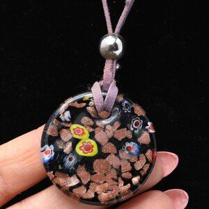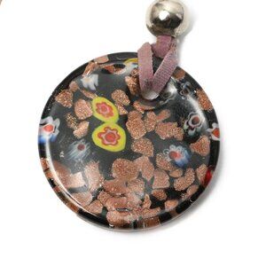 Millefiori Round Glass Pendant Necklace Floral Black Fabric Band Classic