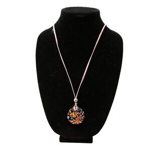 Elevate your style with this exquisite Millefiori Round Glass Pendant Necklace. This necklace features a captivating floral design that will add a touch of elegance to any outfit. The fabric band complements the colourful glass pendant beautifully, creating a classic and timeless look that will never go out of style.