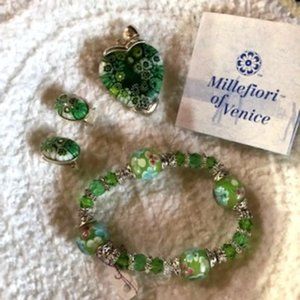 Please note that I am selling this as a set, the clip earrings and the Pendant have the original packaging and the Guarantee hand made with sterling silver, however the beautiful glass bracelet is not Millefiori.