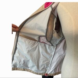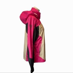 Millet Ladies Unlined spring or fall Jacket. Features Pink, Tan, and Black Colours. Has Inner Pockets and a Detachable Hood. Zipper down the Front for Closure.