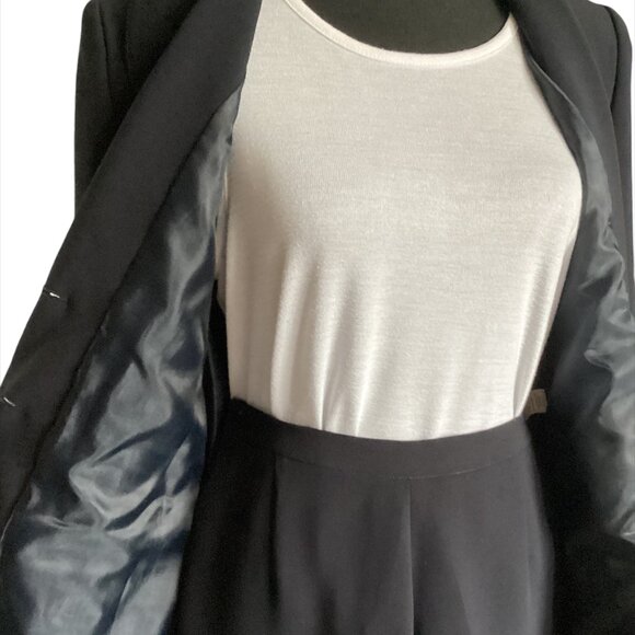 The accompanying pants feature a flat front, a clean 1" waistband, and a zip and button closure for a polished look. Both stylish and practical, this suit is hand washable, making it a convenient addition to our wardrobe. Perfect for business or formal occasions, this classy ensemble is a timeless investment in sophisticated style.