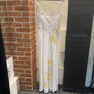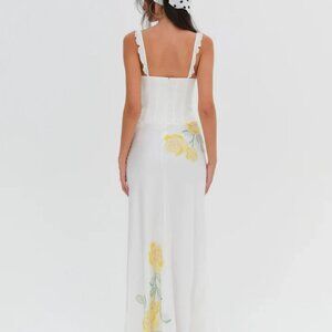 Embrace warm summer nights with the Millie white satin maxi dress printed with large yellow watercolor roses. Featuring ruffled shoulder straps, underwire cups, and a corset panelled bodice, this corset dress is the perfect piece for sunset viewings and evening escapades.